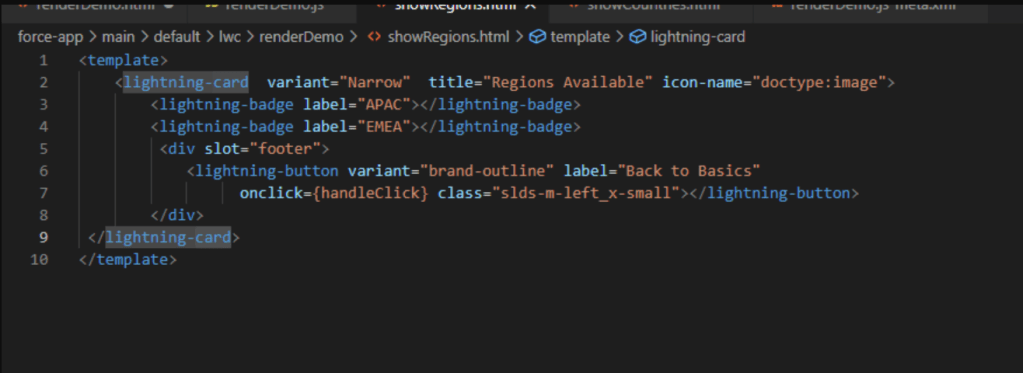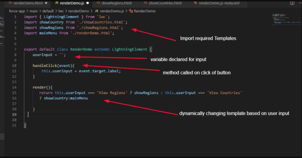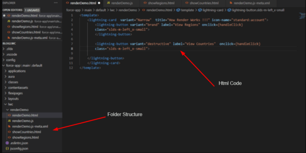 Let say we have a requirement to display the regions and countries of users on button click. To achieve this in LWC, we have created a component named as renderDemo which will contain the necessary .html, .js and meta-xml file. Apart from that we have two separate .html files representing counties and regions as shown below in the image.