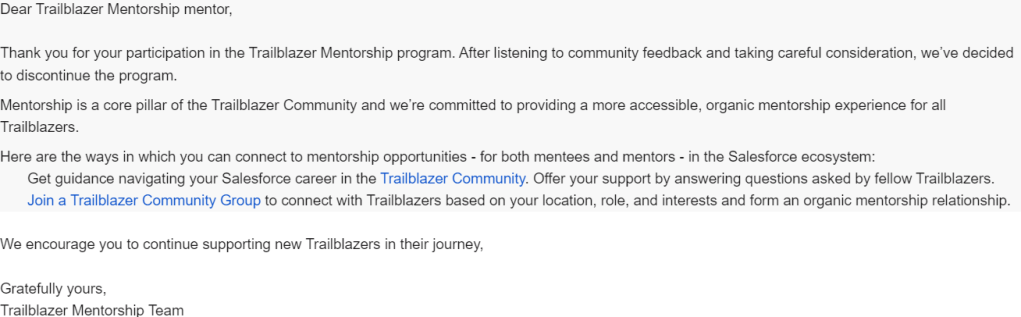 In recent news, Salesforce has made the tough decision to discontinue its mentorship program. This announcement has left many beginners and aspiring Salesforce professionals feeling disheartened and at a loss for guidance in their journey. While this news may seem discouraging, I want to assure you that there is still hope, support, and a thriving community available to help. As a dedicated Salesforce community member, I understand the significance of mentorship programs for aspiring professionals and those looking to make a career switch to Salesforce. I want to offer some insights and guidance for those affected by this decision